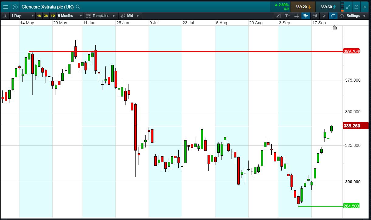 Let’s say you think that Glencore shares have upside potential as result of this broker upgrade. You decide to buy exposure to £10,000 worth of Glencore using a CFD, at the current price of 339p. To do this, you need £2,000.