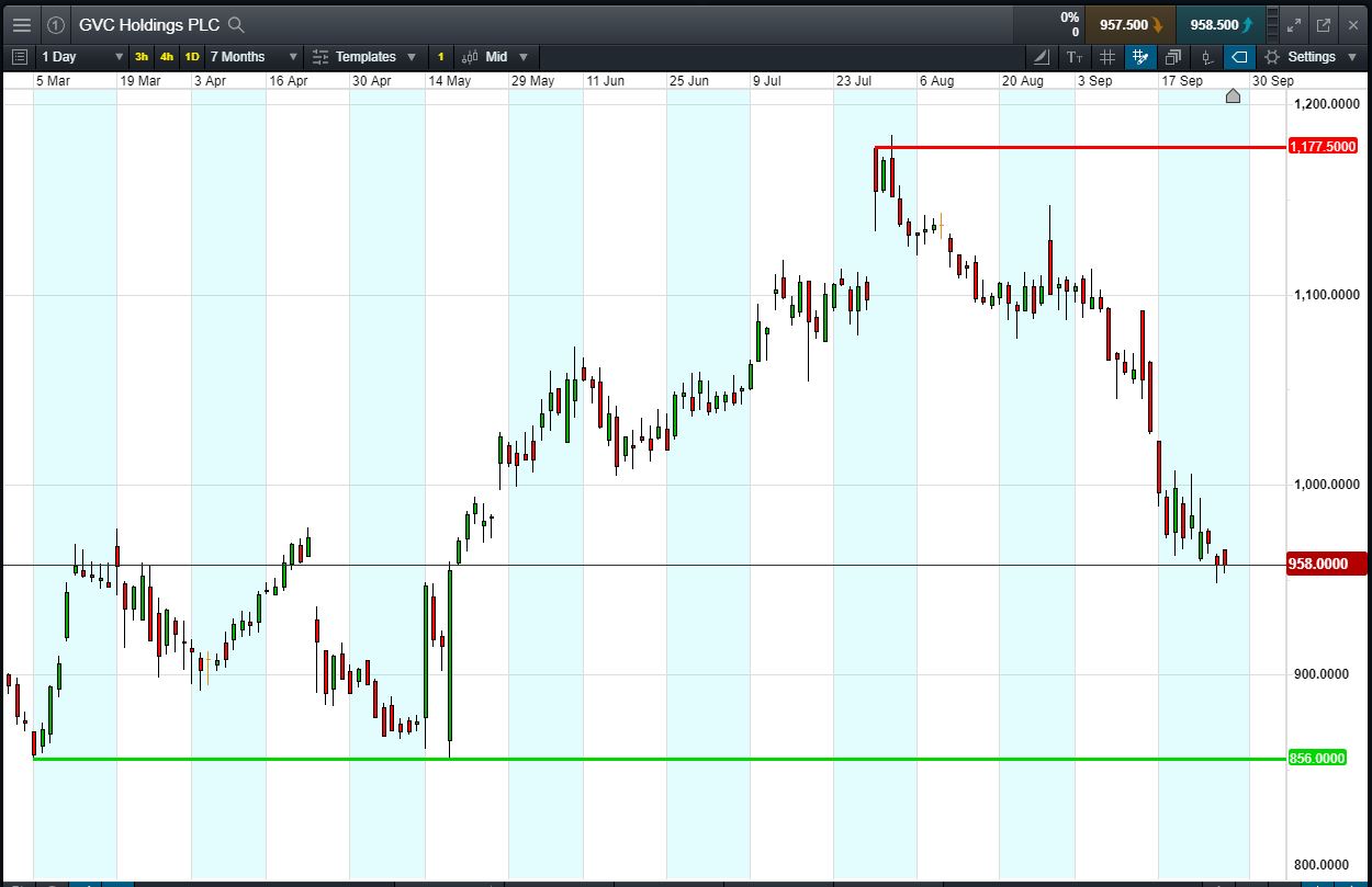 Conversely, let’s assume you open the above position, and place a stop-loss at 10% from the current price. GVC shares continue their July downtrend, they fall 10% and hit your stop-loss. Your loss would be £1,000.