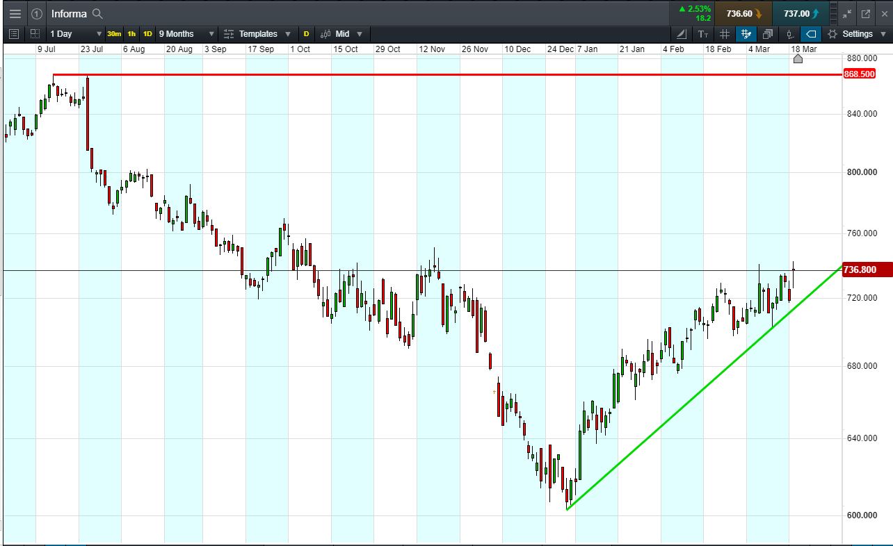 Let’s say you think that Informa shares have upside potential as result of this broker upgrade. You decide to buy exposure to £10,000 worth of Informa using a CFD, at the current price of 736p. To do this, you need £2,000.