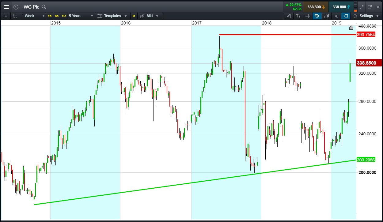 For the purpose of this example, let’s assume the IWG share price rises to prior highs of 393p (+16%). Your profit would be £1600 from your initial investment of £2,000.