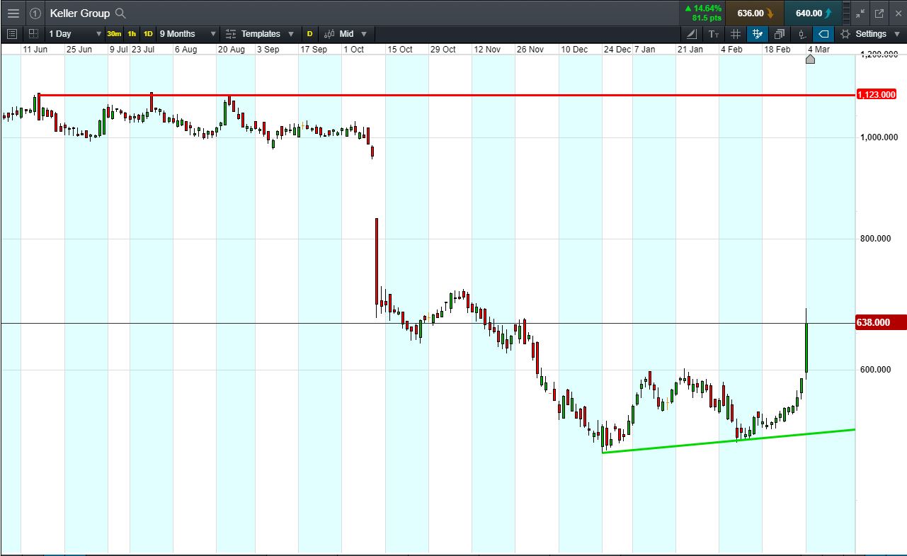 Let’s say you think that Keller shares have upside potential as result of this broker upgrade. You decide to buy exposure to £10,000 worth of Keller using a CFD, at the current price of 642p. To do this, you need £2,000.