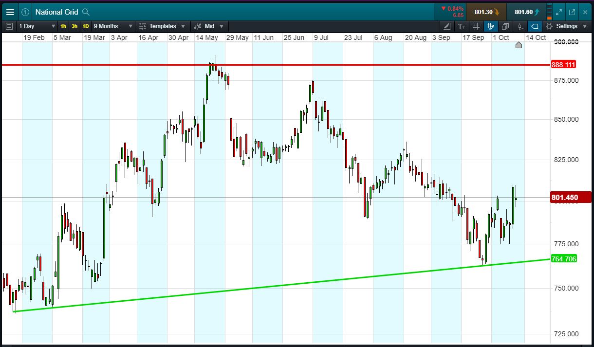 Let’s say you think that National Grid shares have upside potential as result of this broker upgrade. You decide to buy exposure to £10,000 worth of National Grid using a CFD, at the current price of 801p. To do this, you need £2,000.