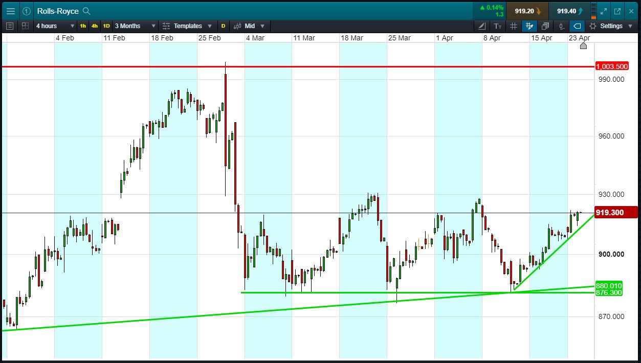 Let’s say you think that Rolls Royce shares have upside potential as result of this broker upgrade. You decide to buy exposure to £10,000 worth of Rolls Royce using a CFD, at the current price of 919p. To do this, you need £2,000.