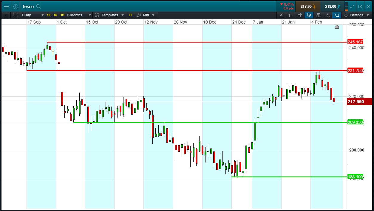 Let’s say you think that Tesco shares have upside potential as result of this broker upgrade. You decide to buy exposure to £10,000 worth of Tesco using a CFD, at the current price of 218p. To do this, you need £2,000.