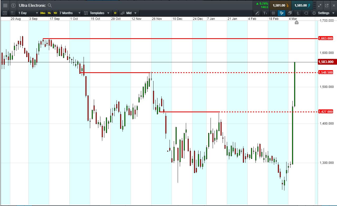 Let’s say you think that Ultra Electronic shares have upside potential as result of this broker upgrade. You decide to buy exposure to £10,000 worth of Ultra Electronic using a CFD, at the current price of 1583p. To do this, you need £2,000.